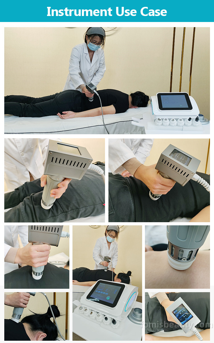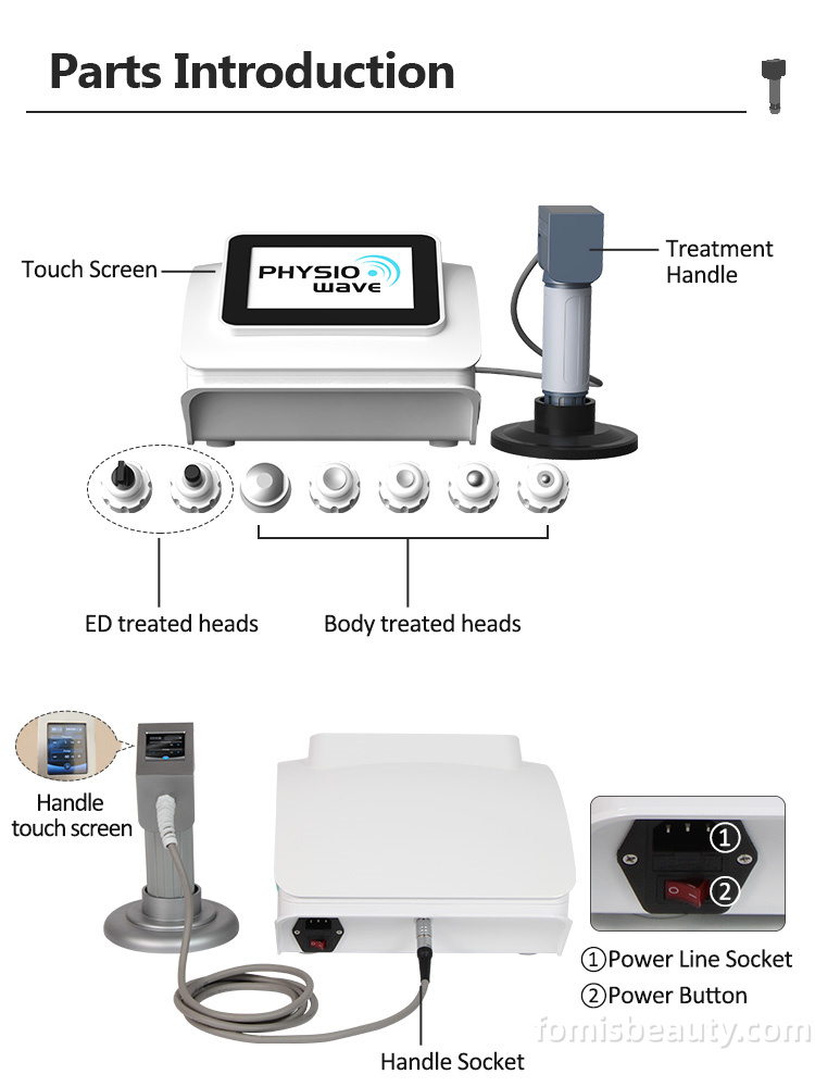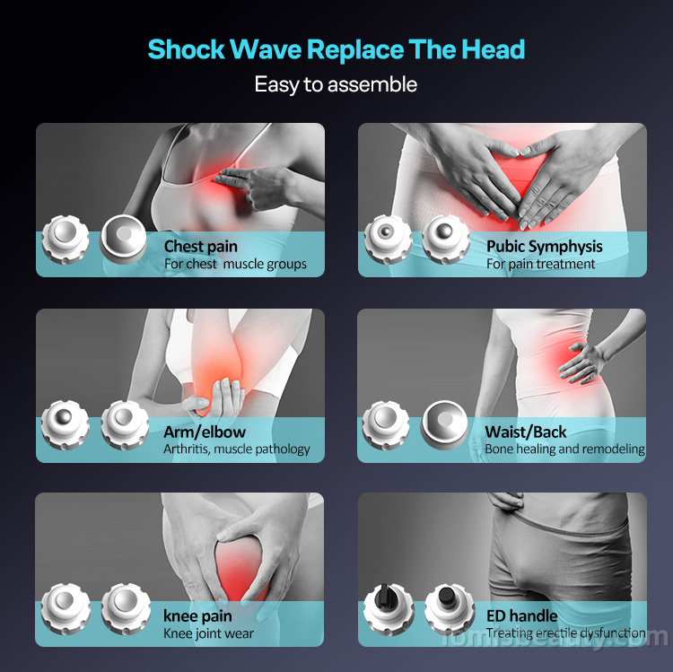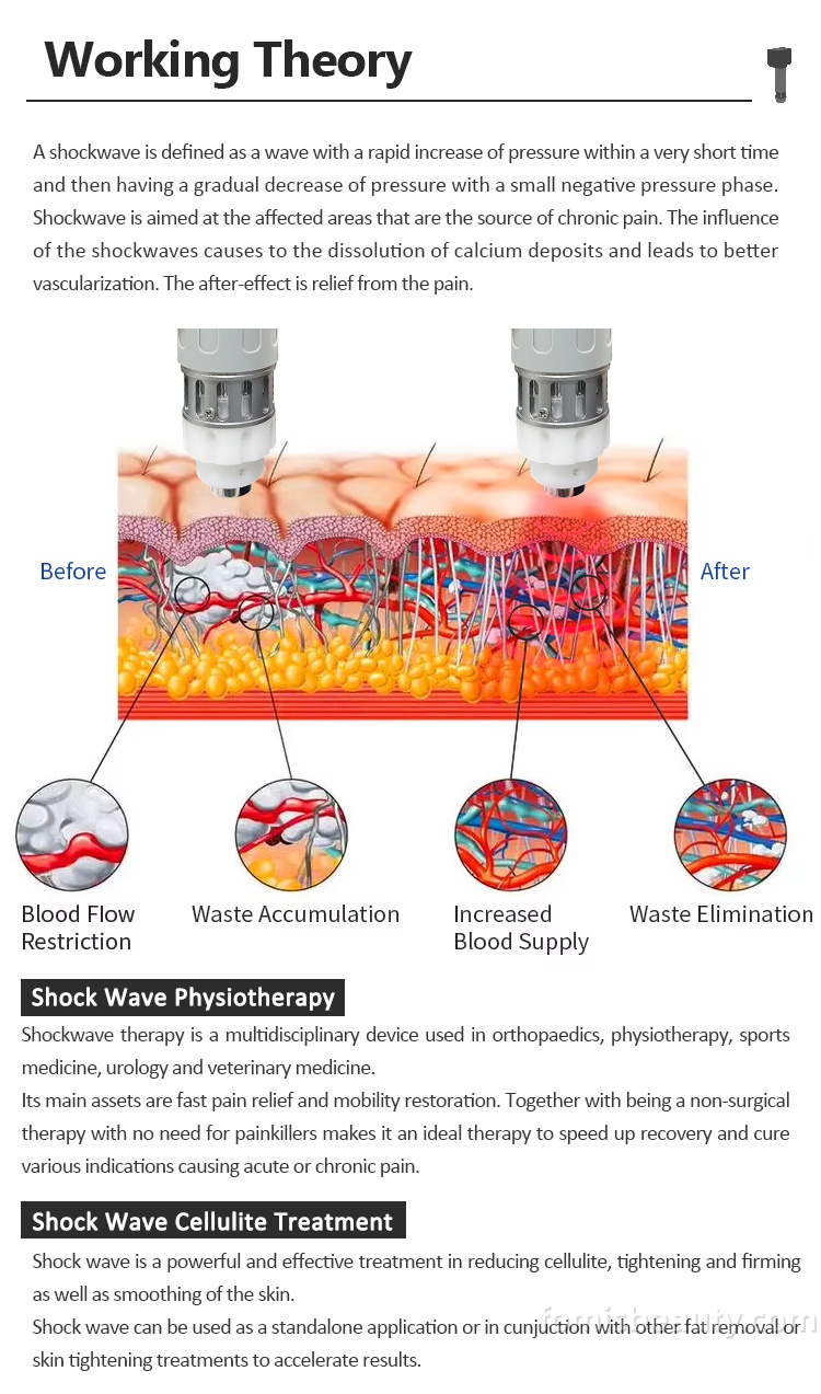A shockwave is defined as a wave with a rapid increase ofpressure within a very short time and then having a gradual decrease of pressure with asmall negative pressure phase. Shockwave is aimed at the affected areas that are thesource of chronic pain. The influence of the shockwaves causes to the dissolution ofcalcium deposits and leads to better vascularization. The after-effect is relief from the pain.Electromagnetic combine Air pressure shock wave machine Air pressure shock Wave &Electromagnetic shock wave Equipment in one machine, is mainly for physiotherapy,sports injury recovery, rehabitation therapy, fat reduce, skin treatment and ED therapy.