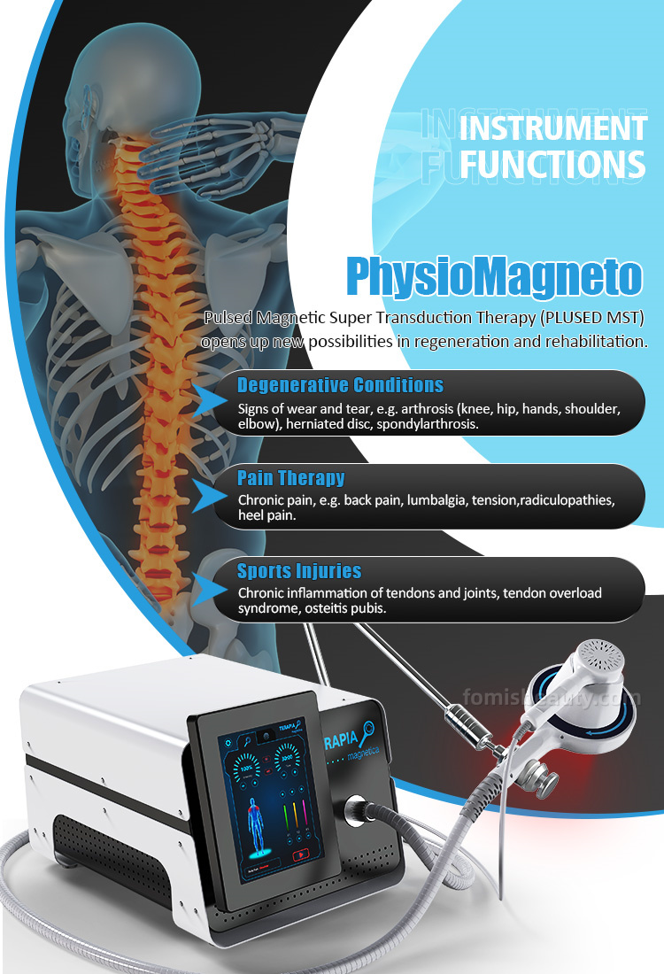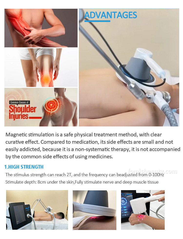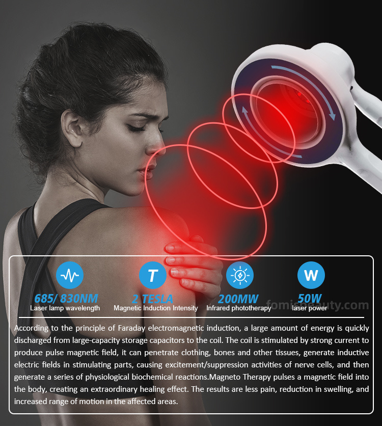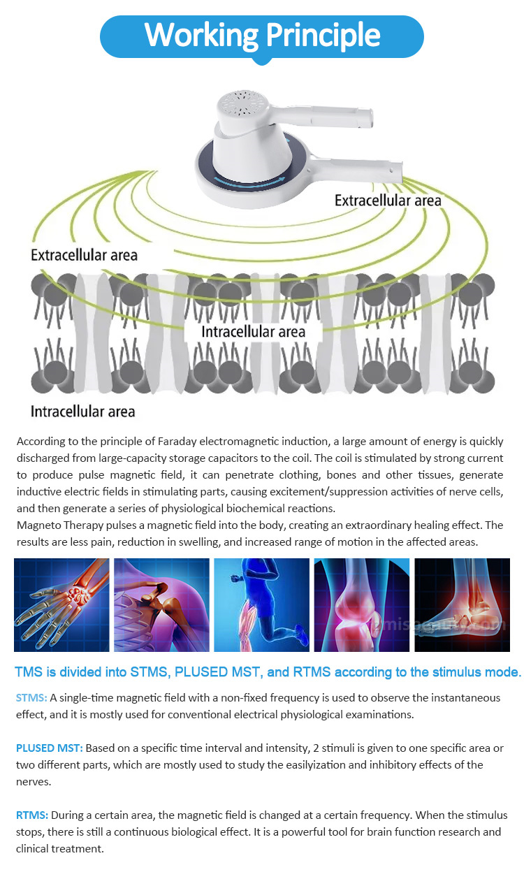 According to the principle of Faraday electromagnetic induction, a large amount of energy is quickly discharged from large-capacity storage capacitors to the coil. The coil is stimulated by strong current to produce pulse magnetic field,it can penetrate clothing, bones and other tissues, generate inductive electric fields in stimulating parts, causing excitement/suppression activities of nerve cells, and then generate a series of physiological biochemical reactions.
